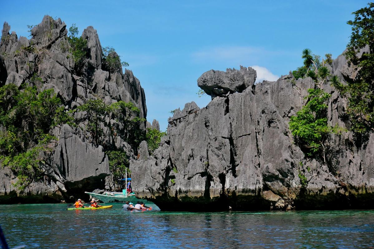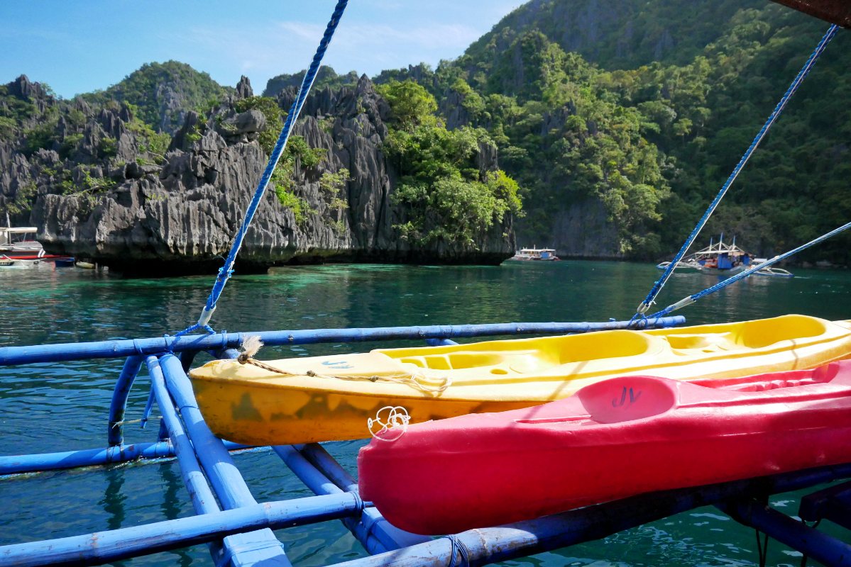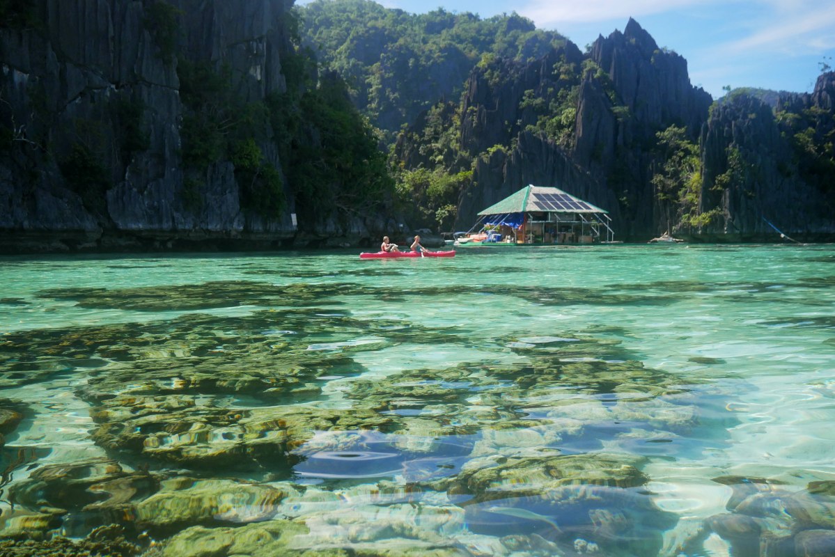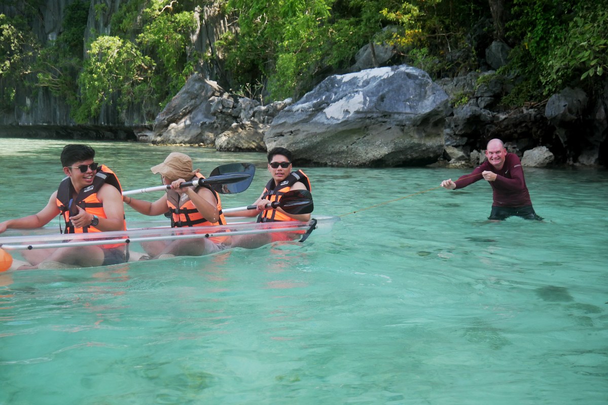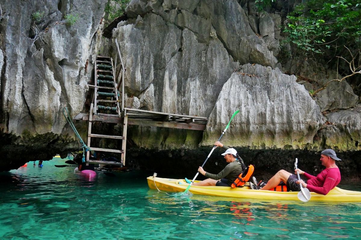Kajakami płyniemy pod niską skałą z jednej części laguny do drugiej. W czasie przypływów tunel jest zalany wodą i wtedy kajaki trzeba przenieść górą po schodach, albo płynąć dookoła skał. Zatrzymujemy się też w słodkowodnych jeziorach Kayangan i Barakuda. W tym ostatnim nasz przewodnik Sonny nurkuje osiągając 6-7 metrów w dół, tak że w ciemnej wodzie tracimy go z oczu. Za chwilę ubiera kamizelkę ratunkową i schodzi z nią w dół 5-6 metrów, jakby nie miała wyporności. Po lunchu płyniemy zobaczyć chiński wrak, który zatonął podczas II wojny światowej, potem do ogrodu koralowców i na wyspę CYC, wokół której oglądamy podwodną łąkę z rozgwiazdami.