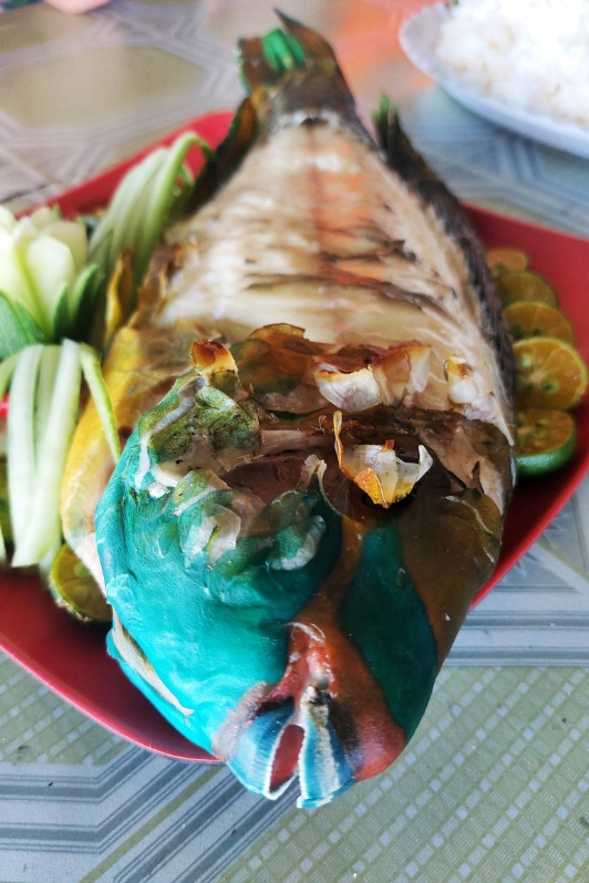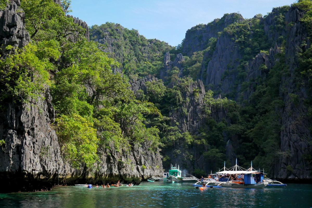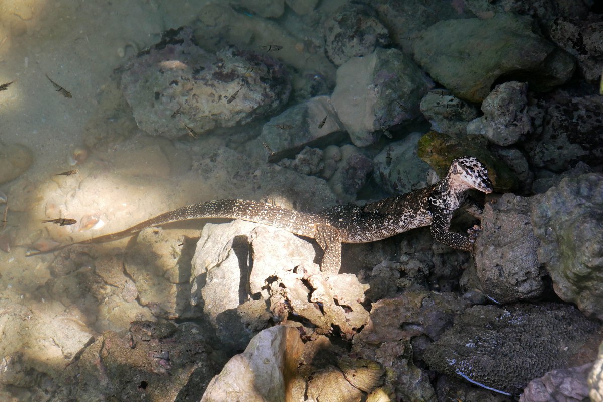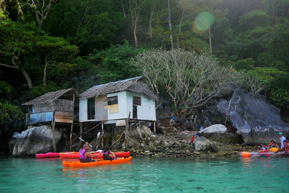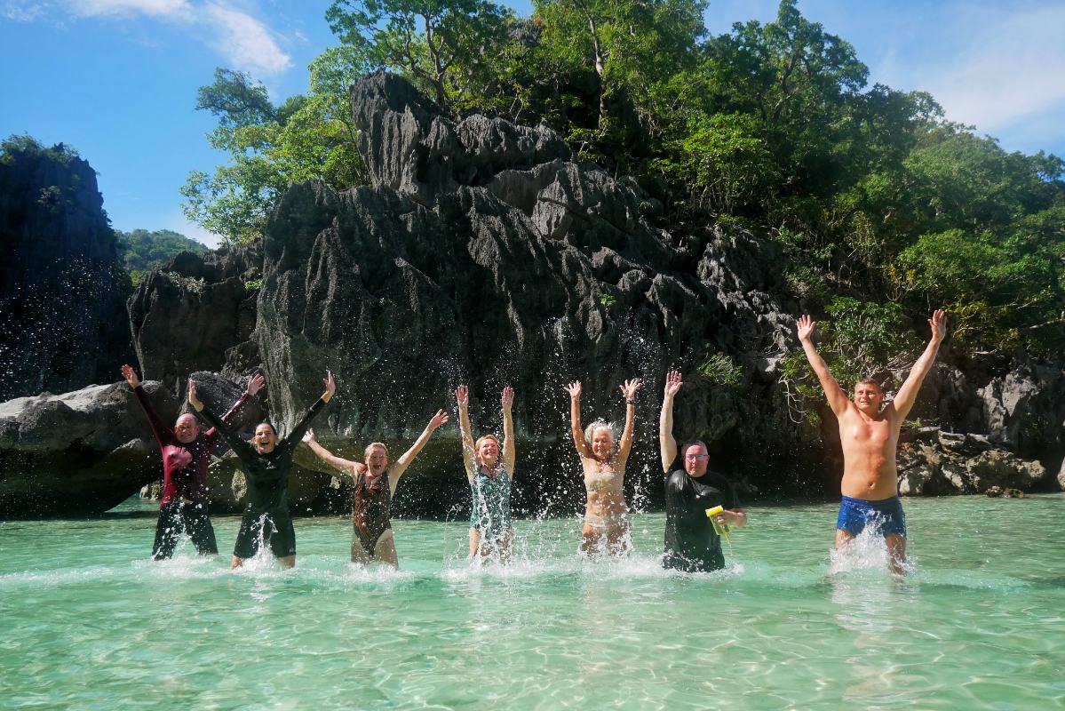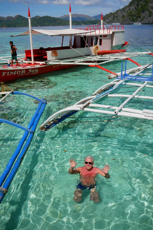 Kajakami płyniemy pod niską skałą z jednej części laguny do drugiej. W czasie przypływów tunel jest zalany wodą i wtedy kajaki trzeba przenieść górą po schodach, albo płynąć dookoła skał. Zatrzymujemy się też w słodkowodnych jeziorach Kayangan i Barakuda. W tym ostatnim nasz przewodnik Sonny nurkuje osiągając 6-7 metrów w dół, tak że w ciemnej wodzie tracimy go z oczu. Za chwilę ubiera kamizelkę ratunkową i schodzi z nią w dół 5-6 metrów, jakby nie miała wyporności. Po lunchu płyniemy zobaczyć chiński wrak, który zatonął podczas II wojny światowej, potem do ogrodu koralowców i na wyspę CYC, wokół której oglądamy podwodną łąkę z rozgwiazdami.
