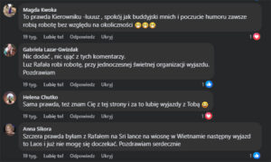 Nie byłoby laotańskiej przygody gdyby nie było z nami Rafała. Zawsze gotowy na kolejny dzień, bez spinki, przygotowany na każdą niespodziankę. Naszą „dziesiątkę” ogarniał bez trudu, chociaż każdego dnia były pytania: Rafał, czy w Laosie są słonie? Rafał czy pojedziemy na plantacje kawy? Rafał co będziemy zwiedzać i dlaczego tylko jeden dzień w Resorcie w dżungli skoro jest tak pięknie? itd. Dziś to żałuję, że nie pływałam w jaskini na dętce jak wszyscy, a niektórzy dwa razy. Rafał dziękuję za te pełne przyrodniczych wrażeń dwa tygodnie. Dzięki Tobie czuliśmy się bezpiecznie. Ze spokojem znosiliśmy trudy nocnych podróży pociągiem i autobusem, nie wspomnę o podróżowaniu busikiem po laotańskich dziurawych drogach. Dużo wrażeń Rafale. Pamiętaj proszę, że lecimy „ekipą” w styczniu 2020 na Sri Lankę, bo w lutym już podobno masz komplet, a Ci którzy nie byli w Wietnamie, jeszcze do Wietnamu, a w następnej kolejności Birma i Japonia .