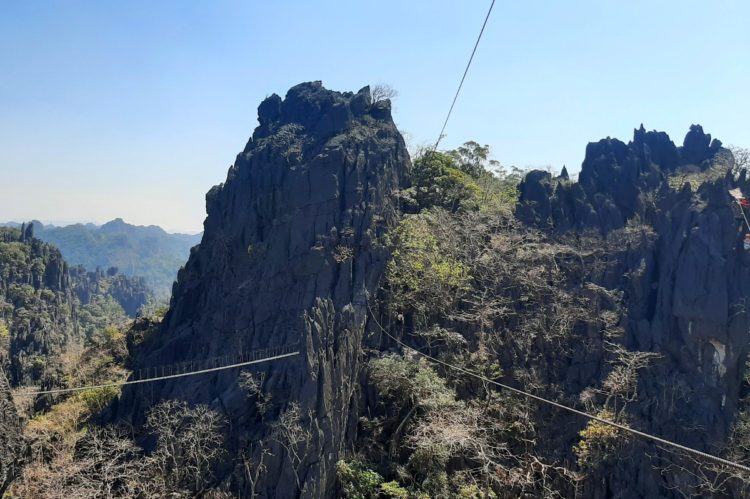 Dalej zatrzymujemy się na chwile na punkcie widokowym The Rock Viewpoint. Okazało się, że jest tam tyrolka za jedyne 30 dolarów. Zapytaliśmy tylko o cenę i jak długo trwa zjazd. Jakoś nie wydało się nam konieczne dopytać o rozkład trasy mimo, że całość miała trwać aż 1,5 godz. Myśleliśmy, że będzie długi lot a potem mozolne wdrapywanie się z powrotem. Ponieważ chętnych było aż 7 osób, Rafał zgodził się zmienić plan dnia. Po pierwszym 480 m locie wylądowaliśmy na skalnej półce i musieliśmy wdrapać się po klamrach na kolejną platformę. Okazało się, że czeka nas zjazd nad 300 m przepaścią, a naprzeciw wznosiła się potężna, groźna, ciemna ściana, na której mieliśmy wylądować. Najstraszliwsza tyrolka, jaką widzieliśmy. Rzeczywiście kilka osób miało problemy, odbiły się od hamulca, wycofały na linie i zostały ściągnięte przez naszych opiekunów. Stamtąd zeszliśmy po grani przepinając się do kolejnych lin rozciągniętych do trzeciego zjazdu. Już wiedzieliśmy, że łatwo nie będzie. Były kolejne tyrolki, wspinaczki przypominające Orlą Perć, mosty drewniane, siatkowe i linowe, a wszystko w otoczeniu oszałamiających widoków, wspaniałych szczytów, skalistych grani i pionowych ścian. Wdrapywaliśmy się też po porośniętym malaryczną dżunglą zboczem, gdzie pożerały nas komary i w końcu wykończeni, ale szczęśliwi dotarliśmy do mety, gdzie rzuciliśmy się na zasłużone piwo. Adrenalina i endorfiny eksplodowały w naszych mózgach i na pewno zostawiły wrażenia do końca życia.