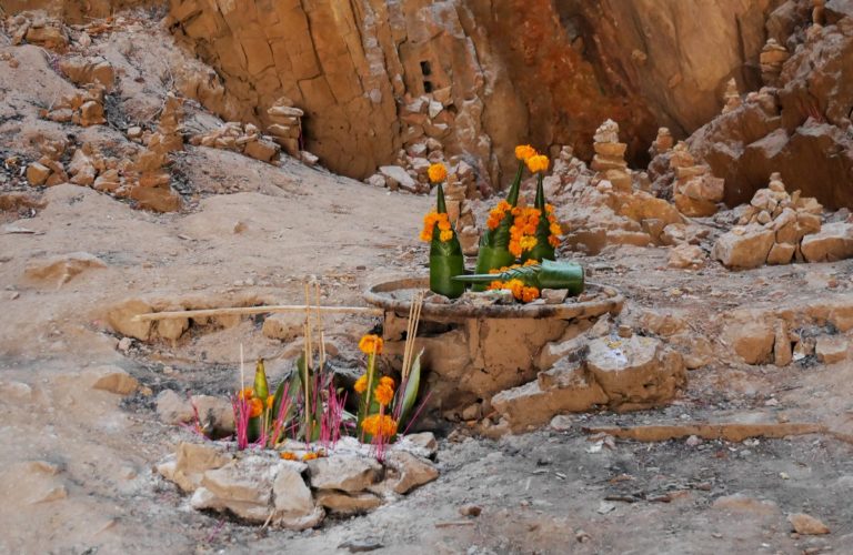 Jaskinia Pak Ou była kiedyś ośrodkiem kultów animistycznych i składano tam ofiary ze zwierząt. Lokalne duchy stały się jej strażnikami.
